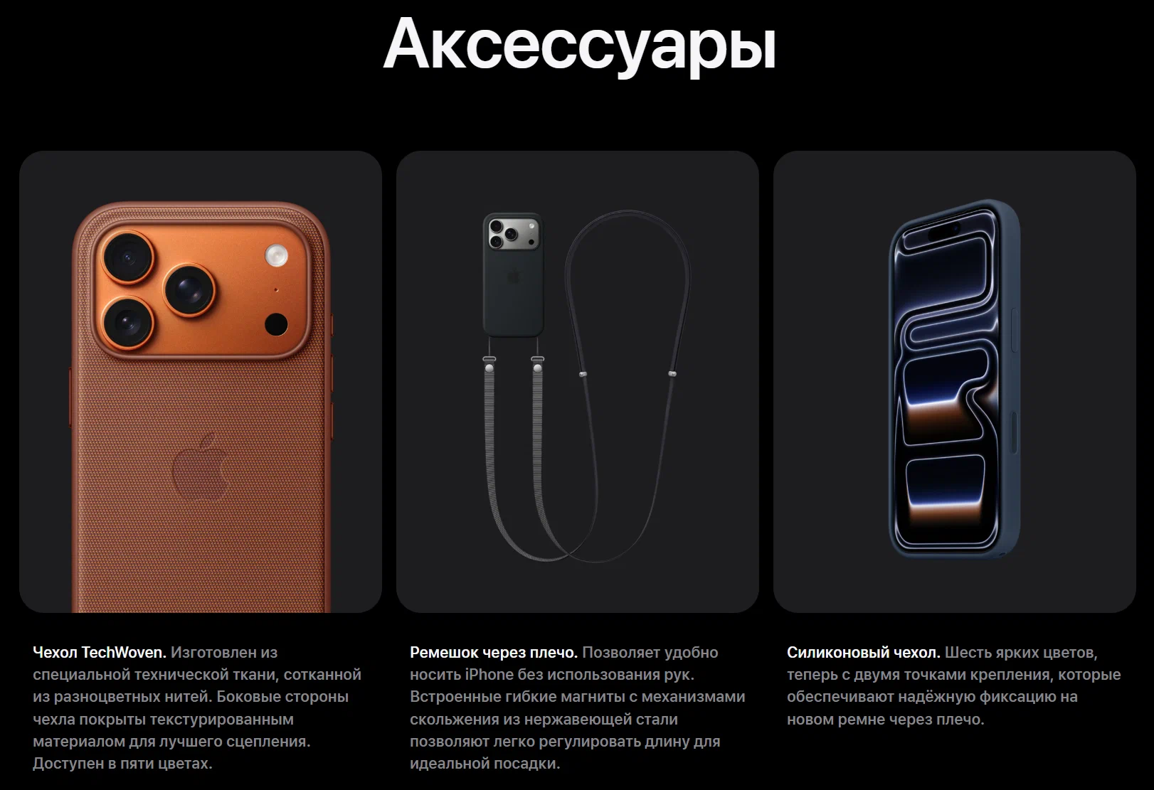 голосовой помощник Siri, кнопка действия, платформа искусственного интеллекта Apple Intelligence, поддержка Dolby Vision, поддержка аксессуаров и устройств беспроводной зарядки MagSafe, пространственное аудио, функция точного определения местоположения iBeacon, географические метки, коррекция искажений объектива, макросъемка, ночной режим, панорамная съемка, портретное освещение с 6 эффектами, портреты с контролем фокусировки и глубины, пространственные фотографии, фотографические стили, функция Smart HDR 5, широкий цветовой диапазон для фотографий и Live Photos
